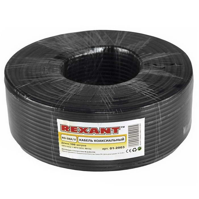 Коаксиальный кабель 01-2003 RG-58 A/U 64% 100м(ч) REXANT представляет собой качественный антенный кабель с диаметром 6.1 мм и сопротивлением 50 Ом. Содержание алюминия в экране составляет 64%, что обеспечивает высокую помехоустойчивость и отличное качество передачи сигнала. Предназначен для применения в различных мобильных устройствах, таких как радиостанции и спутниковое телевидение. Кабель поставляется в упаковке длиной 100 м, что идеально подходит для монтажа длинных трасс или для соединения нескольких антенн.