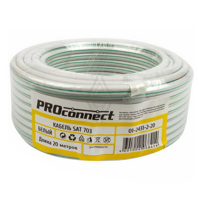 Коаксиальный кабель 01-2431-2-20 SAT 703B 75% 20м(б) PROCONNECT это кабель с сопротивлением 75 Ом и наружным диаметром 6.8 миллиметров, используемый для передачи телевизионных и видеосигналов. Его экранирующая оплетка на 75% состоит из меди, за счет чего обеспечивается эффективное подавление радиопомех и качественная передача сигнала. Кабель реализуется в бухтах по 20 метров и предназначен для систем видеонаблюдения и бытовых ТВ-систем.