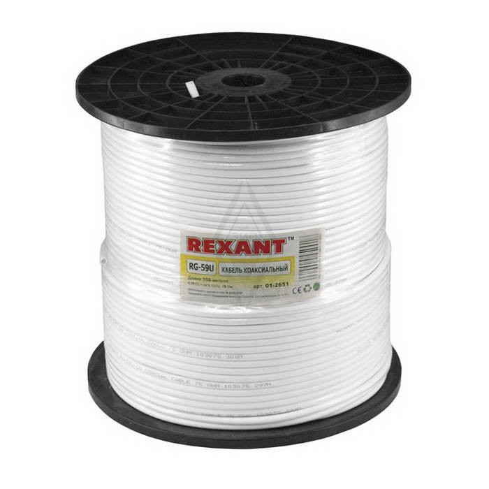 Коаксиальный кабель 01-2651 RG-59U+Cu 64% 305м(б) REXANT это высококачественный телевизионный кабель, предназначенный для передачи видеосигнала со стандартным сопротивлением 75 Ом при наружном диаметре 6 мм. Кабель имеет тройное экранирование, состоящее из алюминиевой фольги, оплетки из медных луженых проволок (64%) и дополнительного слоя фольги, что обеспечивает эффективное подавление внешних радиопомех на пути прохождения видеосигнала. Данный кабель продается на бухтах по 305 метров и применяется для подключения телевизионных антенн, спутниковых систем и других устройств видеопередачи на большие расстояния, требуя профессионального монтажа.