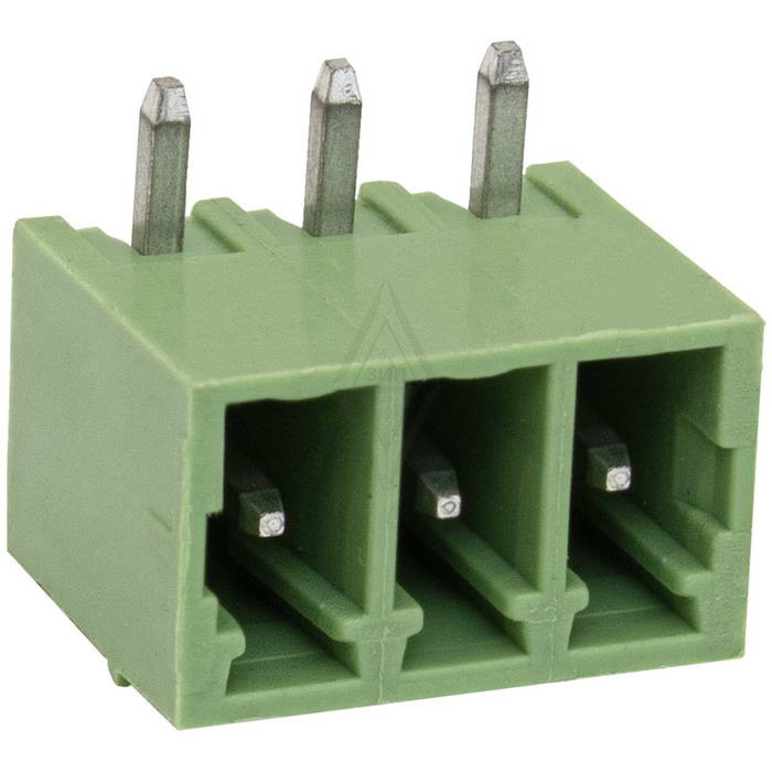 Разъемный клеммный блок на плату угловой (R) RUICHI 15ERGRC-3.5-03P, вилка (M), 3 контакта, шаг 3.50 мм - это конструкции, состоящие из 2-х, или более частей. В большинстве случаев, одна из которых крепится на плате, а вторая на кабеле. Для соединения подвижная часть клеммника вставляется в неподвижную и фиксируется зажимной пластиной.