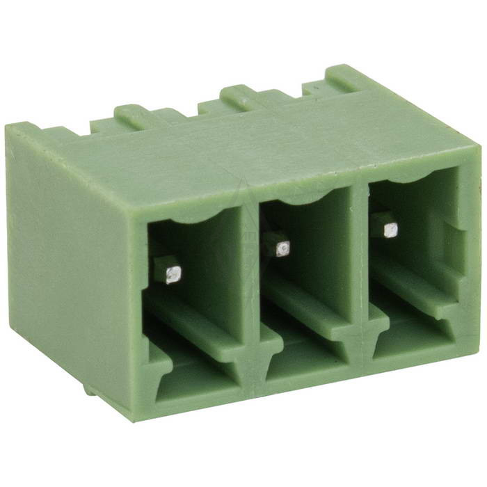 Разъемный клеммный блок на плату RUICHI 15ERGVC-3.81-03P, вилка (M), 3 контакта, шаг 3.81 мм – это конструкции, состоящие из 2-х, или более частей. В большинстве случаев, одна из которых крепится на плате, а вторая на кабеле. Для соединения подвижная часть клеммника вставляется в неподвижную и фиксируется зажимной пластиной.