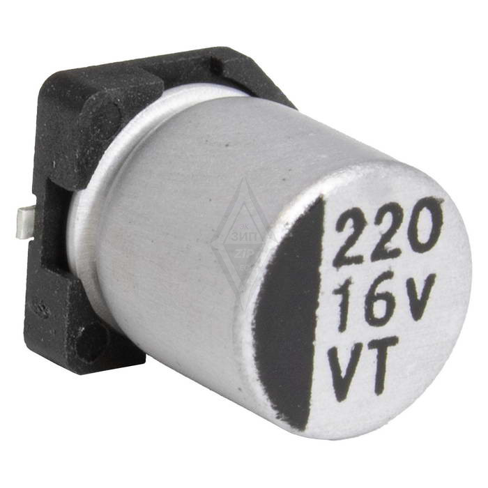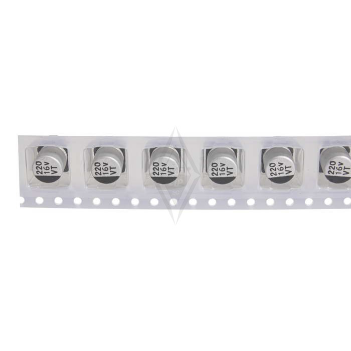 Конденсатор электролитический для поверхностного монтажа серии VT. Номинальная ёмкость 220 мкФ (±20%), напряжение 16 В. Ток пульсации 110 мА. Диаметр 6.3 мм. Высота 7.7 мм. Минимальная наработка на отказ 2000 часов. Рабочий диапазон температур -55…+105 °C