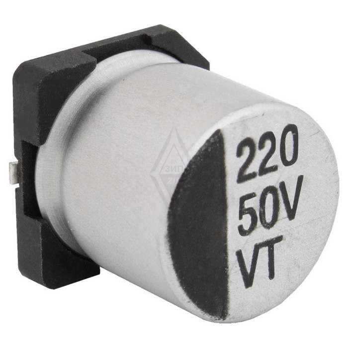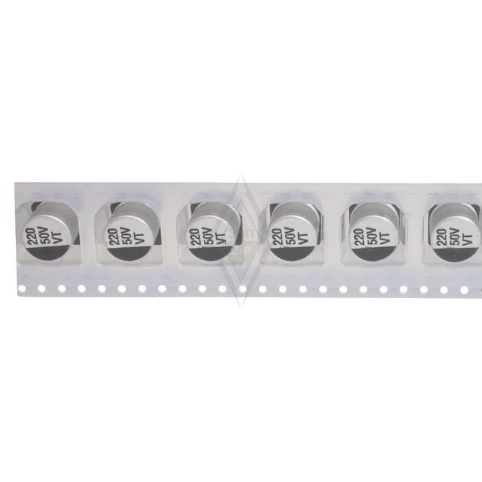 Конденсатор электролитический для поверхностного монтажа серии VT. Номинальная ёмкость 220 мкФ (±20%), напряжение 50 В. Ток пульсации 220 мА. Диаметр 10 мм. Высота 10.5 мм. Минимальная наработка на отказ 2000 часов. Рабочий диапазон температур -55…+105 °C.