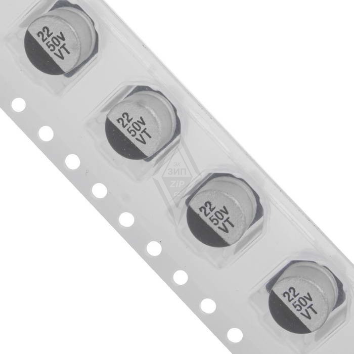 Конденсатор электролитический для поверхностного монтажа серии VT. Номинальная ёмкость 22 мкФ (±20%), напряжение 50 В. Ток пульсации 42 мА. Диаметр 6.3 мм. Высота 5.4 мм. Минимальная наработка на отказ 2000 часов. Рабочий диапазон температур -55…+105 °C.