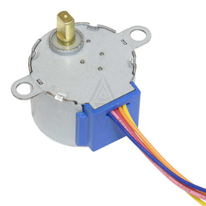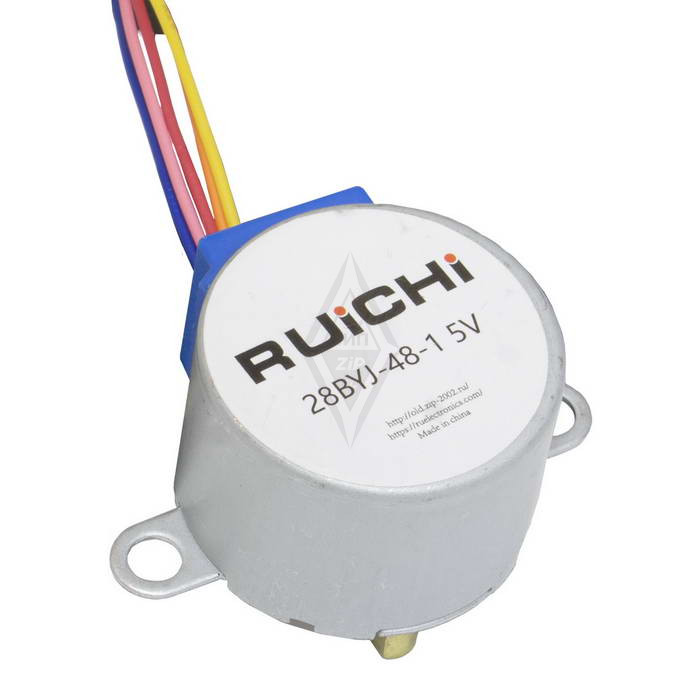 Шаговый электромотор 28BYJ-48 12В представляет собой бесщёточный (бесколлекторный) синхронный двигатель, на вал которого установлен редуктор. В конструкции мотора имеется несколько индуктивных обмоток, расположенных вокруг магнитного ротора. Управление вращением вала осуществляется поочерёдной последовательной подачей тока на обмотки мотора, как на одну, так и одновременно на несколько. Благодаря этому, ротор способен поворачиваться на определённый угол относительно оси вала и фиксироваться в новом положении. Каждый минимально возможный поворот ротора с последующим его удержанием называется "шагом" двигателя.
