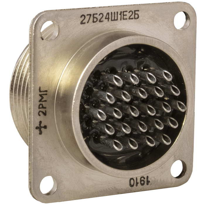 2рм_2рмг_2рмт_рмг_онц-рг 2РМГ27Б24Ш1Е2Б ЭЛЕКТРОСОЕДИНИТЕЛЬ это цилиндрический малогабаритный герметичный разъём с 24 контактами. Он предназначен для работы в электрических цепях постоянного и переменного тока частотой до 3 МГц. Вилка имеет блочное исполнение, покрытие контактов выполнено химическим никелем, а теплостойкость составляет 200 °C.