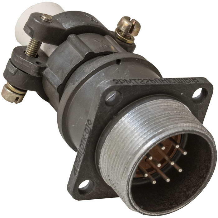 2рм_2рмг_2рмт_рмг_онц-рг 2РМТ22БПН10Ш1В1В это соединитель низкочастотный цилиндрический с условным размером корпуса 22 мм, прямым патрубком, гайкой для неэкранированного кабеля и серебряным покрытием контактов. Он предназначен для работы в электрических цепях постоянного и переменного токов частотой до 3 МГц при напряжении 560 или 700 В в зависимости от типономинала. Соединитель состоит из двух частей: вилки и розетки, имеет резьбовое сочленение и одношпоночную поляризацию корпусов.