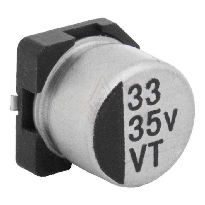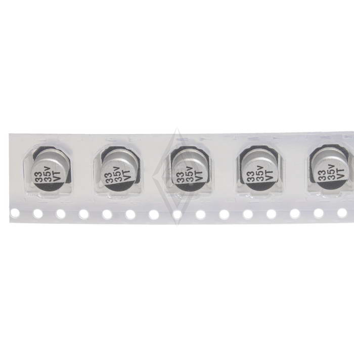 Конденсатор электролитический для поверхностного монтажа серии VT. Номинальная ёмкость 33 мкФ (±20%), напряжение 35 В. Ток пульсации 80 мА. Диаметр 6.3 мм. Высота 5.4 мм. Минимальная наработка на отказ 2000 часов. Рабочий диапазон температур -55…+105 °C.