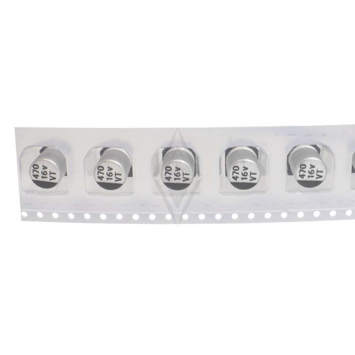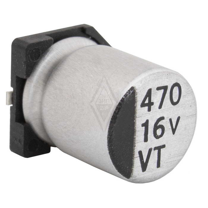 Конденсатор электролитический для поверхностного монтажа серии VT. Номинальная ёмкость 470 мкФ (±20%), напряжение 16 В. Ток пульсации 300 мА. Диаметр 8 мм. Высота 10.5 мм. Минимальная наработка на отказ 2000 часов. Рабочий диапазон температур -55…+105 °C