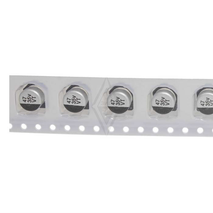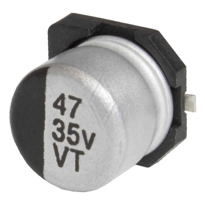 Конденсатор электролитический для поверхностного монтажа серии VT. Номинальная ёмкость 47 мкФ (±20%), напряжение 35 В. Ток пульсации 65 мА. Диаметр 6.3 мм. Высота 5.4 мм. Минимальная наработка на отказ 2000 часов. Рабочий диапазон температур -55…+105 °C.