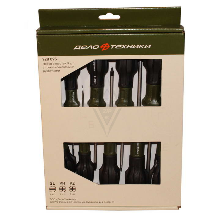 Наборы отверток 728095 Набор отверток 9шт Дело Техники включает инструменты с трёхкомпонентными рукоятками разных размеров: 3×75, 5×100, 6,5×150, PH0×75, PH1×100, PH2×150, PZ1×100, PZ2×150, PH2×SL6×38 мм. Отвёртки изготовлены методом холодной штамповки с последующей термообработкой и защищены от коррозии хромированием. Намагниченные наконечники обеспечивают удобство работы в труднодоступных местах.