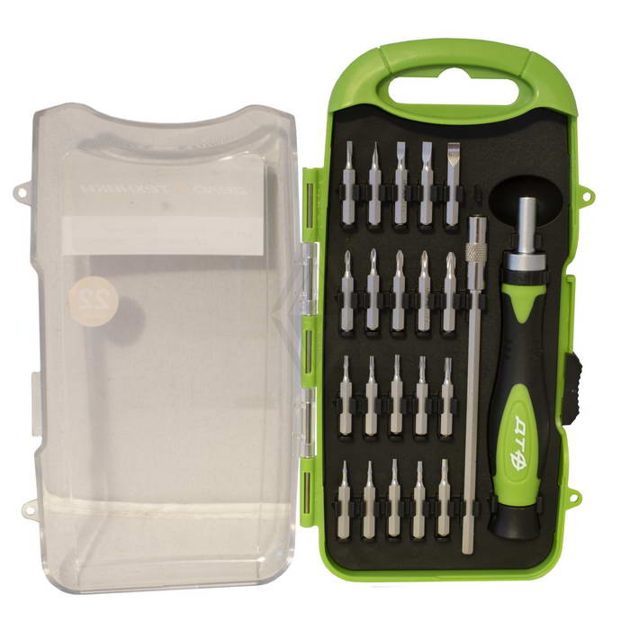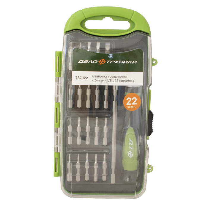 Наборы отверток 787122 Отвертка трещоточная 22 Дело Техники включает в себя 22 предмета и предназначена для работы с разнообразными крепежными элементами с прямым и крестообразным шлицем. Благодаря наличию трещоточного механизма, отвертка позволяет быстро и удобно закручивать и откручивать винты в труднодоступных местах. Стержни инструментов изготовлены из высокопрочной стали S2. Отвертка поставляется в удобном пластиковом кейсе.
