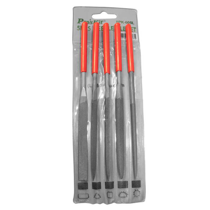 Надфили 8PK-605L ProsKit предназначены для обработки различных поверхностей, таких как металл, дерево, пластик и других материалов. Набор состоит из 5 надфилей различных форм и размеров, что позволяет выполнять различные задачи. Надфили изготовлены из высококачественной инструментальной стали, обеспечивающей их прочность и длительный срок службы. Двухкомпонентная эргономичная рукоять обеспечивает удобный захват и снижает нагрузку на руку при продолжительной работе. Набор поставляется в пластиковом пенале для удобства хранения и транспортировки.