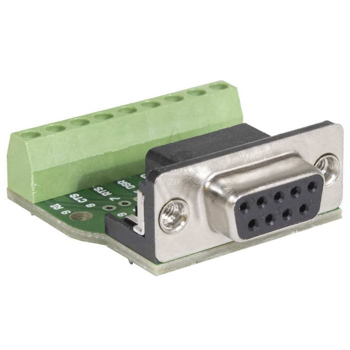 Электронный сигнальный модуль на плате адаптера DRB-09FB (розетка) RUICHI 903-3B для RS-232 интерфейса. Эта конфигурация используется чаще всего при подключении к какому-либо устройству с помощью ПК. Имеет выход нескольких проводов на винтовой клеммный блок. Шаг клемм 2.77 мм. Цвет: черный, зеленый.