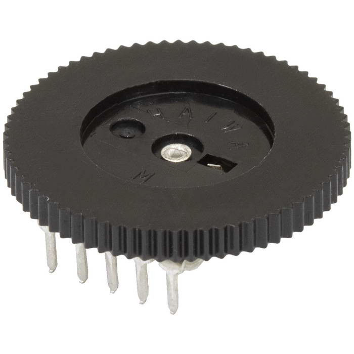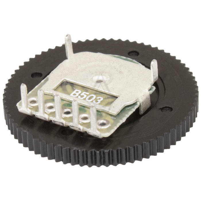 Дуплексный зубчатый потенциометр (переключатель громкости) RUICHI B503, 50 кОм, 1 А, 50 В/12 В, 5 контактов, корпус: толщина 2 мм, диаметр 20 мм используются при многократных регулировках аппаратуры, обладают большой износоустойчивостью.