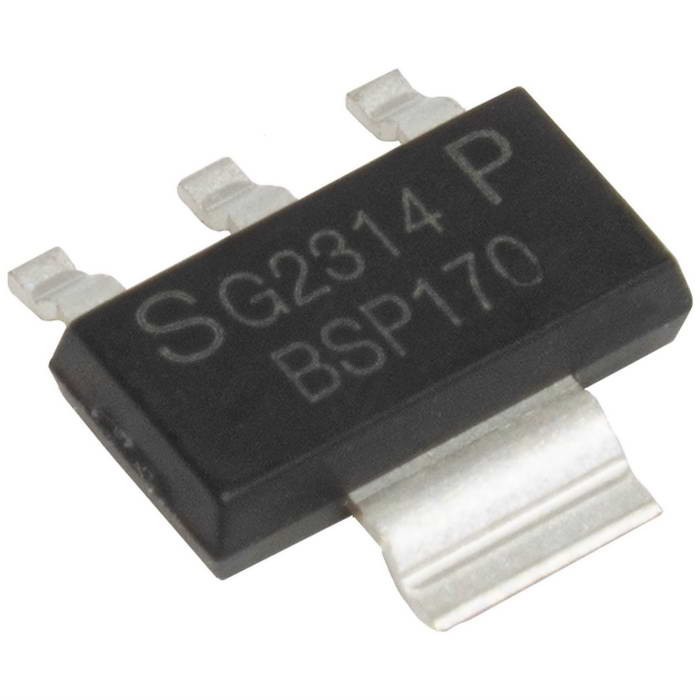 BSP170P P-канальный полевой транзистор для поверхностного монтажа в корпусе SOT-223. Напряжение сток-исток -60 Вольт, максимальный ток стока -3 А. Сопротивление канала в открытом состоянии 15 мОм (при Vgs=-10 В, Id =-0.5 А).