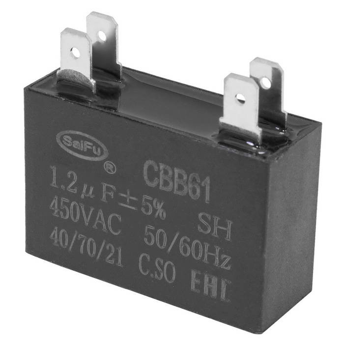 CBB61 1.2 uF 450V 4 PIN пленочный конденсатор. Максимальное напряжение 450 В. Номинальная ёмкость 1.2 мкФ ±5 %. Выводы - 4 клеммы. Предназначен для работы в качестве пускового / рабочего конденсатора для электродвигателей, а также в качестве фильтрового конденсатора для переменного тока.