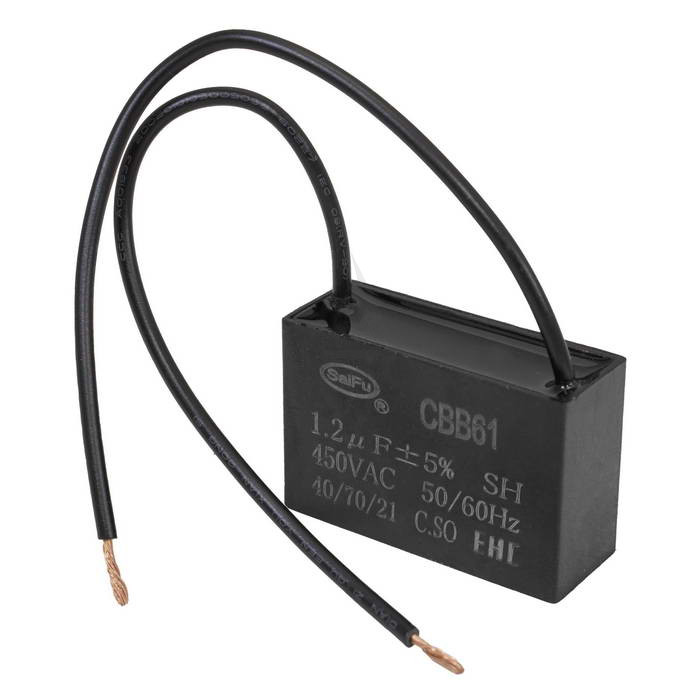 CBB61 1.2 uF 450V пленочный конденсатор. Максимальное напряжение 450 В. Номинальная ёмкость 1.2 мкФ ± 5 %. Выводы - гибкий провод (10-15 см). Предназначен для работы в качестве пускового / рабочего конденсатора для электродвигателей, а также в качестве фильтрового конденсатора для переменного тока.