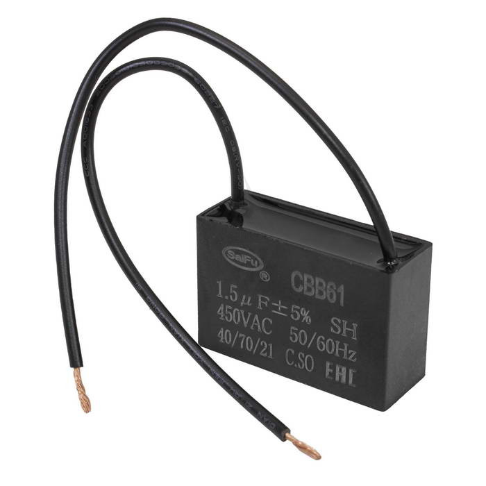 CBB61 1.5 uF 450V пленочный конденсатор. Максимальное напряжение 450 В. Номинальная ёмкость 1.5 мкФ ± 5 %. Выводы - гибкий провод (10-15 см). Предназначен для работы в качестве пускового / рабочего конденсатора для электродвигателей, а также в качестве фильтрового конденсатора для переменного тока.
