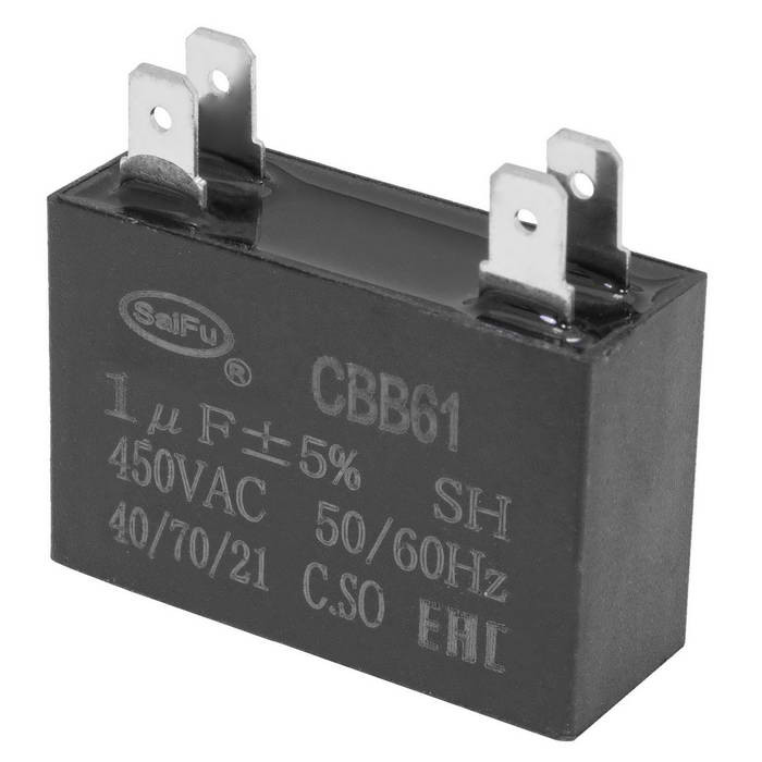 CBB61 1 uF 450V 4 PIN пленочный конденсатор. Максимальное напряжение 450 В. Номинальная ёмкость 1 мкФ ±5 %. Выводы - 4 клеммы. Предназначен для работы в качестве пускового / рабочего конденсатора для электродвигателей, а также в качестве фильтрового конденсатора для переменного тока.