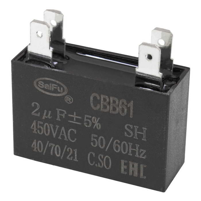 CBB61 2 uF 450V 4 PIN пленочный конденсатор. Максимальное напряжение 450 В. Номинальная ёмкость 2 мкФ ±5 %. Выводы - 4 клеммы. Предназначен для работы в качестве пускового / рабочего конденсатора для электродвигателей, а также в качестве фильтрового конденсатора для переменного тока.