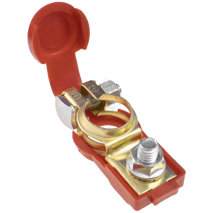 Клеммы аккумуляторные переходные RUICHI CHA009, 2 штуки в комплекте, диаметр разъема 17 мм, латунь, корпуса пластиковые, красный/черный - это электрические контакты, используемые для подключения нагрузки или зарядного устройства к одноэлементной или многоэлементной аккумуляторной стартерной батареи.