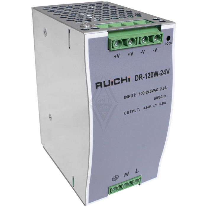 Блок питания на DIN-рейку RUICHI DR-120-24, 100-240 В (АС) 5 А, 24 В, в металлическом корпусе представляет собой преобразователь из напряжения переменного тока (AC) в напряжение постоянного тока (DC) большой мощности модульного типа. Отличительными особенностями импульсных блоков питания на на DIN-рейку является, высокая мощность и отказоустойчивость, и широкий диапазон рабочей температуры - от -30 до +70 °С.