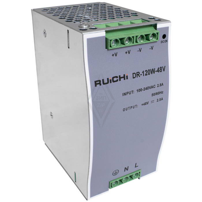 Блок питания на DIN-рейку RUICHI DR-120-48, 100-240 В (АС) 2,5 А, 48 В, в металлическом корпусе представляет собой преобразователь из напряжения переменного тока (AC) в напряжение постоянного тока (DC) большой мощности модульного типа. Отличительными особенностями импульсных блоков питания на на DIN-рейку является, высокая мощность и отказоустойчивость, и широкий диапазон рабочей температуры - от -30 до +70 °С.