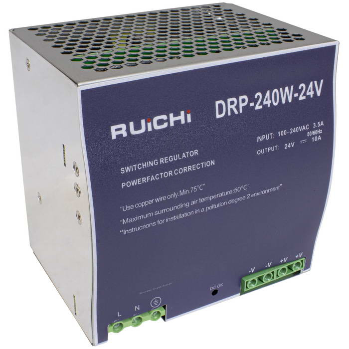 Блок питания на DIN-рейку RUICHI DRP-240-24, 100-240 В (АС) 10 А, 24 В, в металлическом корпусе представляет собой преобразователь из напряжения переменного тока (AC) в напряжение постоянного тока (DC) большой мощности модульного типа. Отличительными особенностями импульсных блоков питания на на DIN-рейку является, высокая мощность и отказоустойчивость, и широкий диапазон рабочей температуры - от -30 до +70 °С.