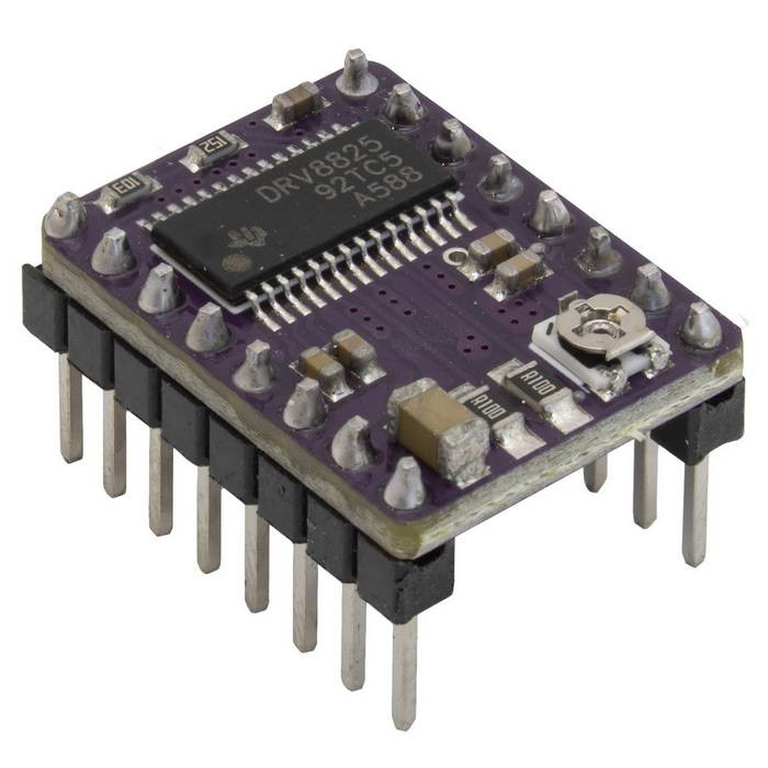 DRV8825 - это плата управления для шаговых двигателей позволяющий работать с шагом 1, 1/2, 1/4, 1/8, 1/16, 1/32. Модуль драйвер может управлять двигателями с напряжением питания до 45 В и током ± 2 A (до 2.2 А).