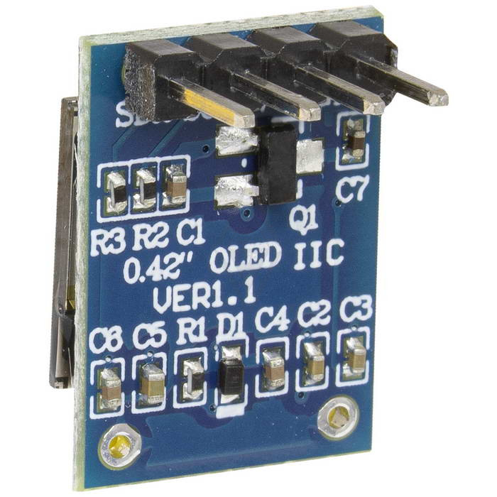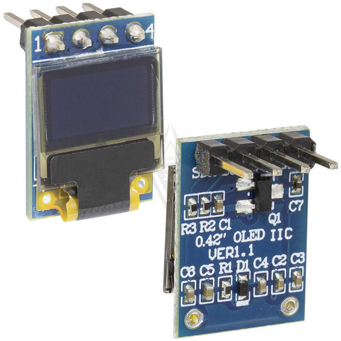 Ультракомпактный 0.42" OLED-модуль на контроллере SSD1306 (белое свечение) с разрешением 72x40 точек. Интерфейс I2C, 4 вывода: GND, VCC, SCL, SDA; питание 3.3 В, шаг контактов 2.54 мм. Габариты 12x17 мм, область отображения 9.196 5.18 мм, высокая контрастность, низкое энергопотребление и широкий угол обзора. Идеален для мини-устройств, носимой электроники, IoT и DIY-проектов; рабочая температура -40…+70 °C.