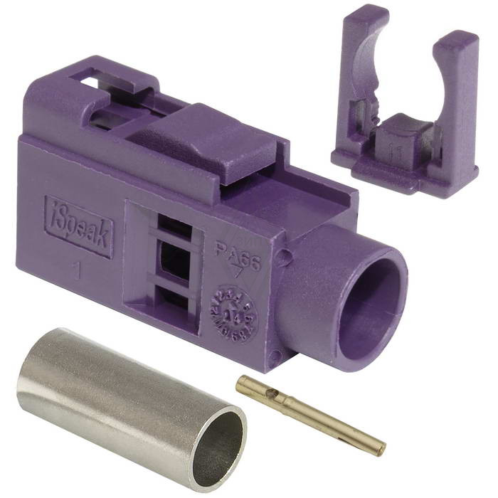 Высокочастотный разъем RUICHI серии FAKRA TYPE D-J (розетка) для коммутации оборудования GSM, обжимной, на кабель RG174/RG316, 5000 МОм, -40…+105 °C, цвет корпуса фиолетовый (RAL 4004) используется для подключения разнообразного радиооборудования. Высокочастотный коннектор имеет прямую конфигурацию и предназначен для установки на кабель RG-316 или RG-174 методом обжима. Обычно эти тонкие кабели используются для изготовления коротких соединительных адаптеров (пигтейлов), а также для коммутации оборудования на небольшом расстоянии.
