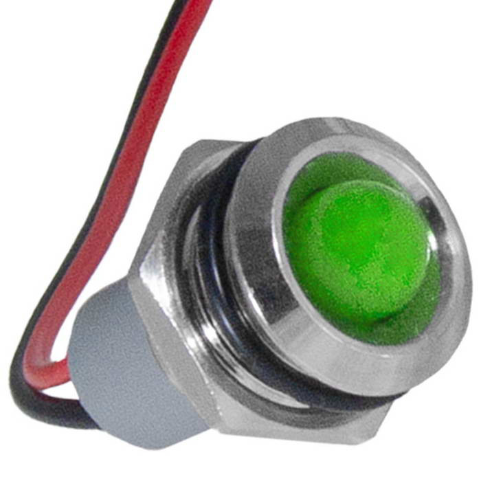 Индикатор антивандальный RUICHI GQ10WR-G, цвет зеленый, точечный излучатель, 12-24 В, 15 мА, гибкие выводы, никелированная латунь - это источник света для демонстрации электрических процессов в приборах. Конструктивно представляет собой модуль индикации, оснащенный контактным блоком, к которому припаиваются или присоединяются проводники.