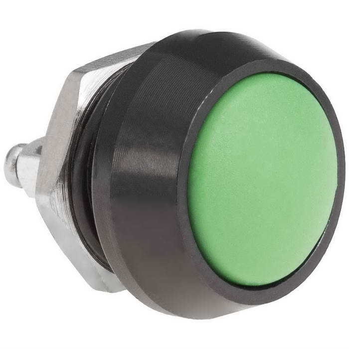 Кнопка антивандальная без подсветки RUICHI GQ12B-10/B/G/N, 1NO, ОFF-(ON) без фиксации, пос. диаметр 12 мм, контакты 2S, 2 А, 50 мОм, -20...+55 °C, корпус пластиковый черный, кнопка зеленая максимально долговечна и надежна. Устройство способно безотказно работать при частой эксплуатации и самых тяжелых условиях. Именно поэтому такие кнопки устанавливаются в тех местах, где существует повышенный риск повреждения, например, на производственных предприятиях или объектах с большой проходимостью людей. Антивандальные кнопки часто можно встретить в лифтах, около входных дверей зданий или метрополитене.
