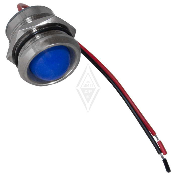 Индикатор антивандальный RUICHI GQ16WR-B, цвет синий, точечный излучатель, 12-24 В, 15 мА, гибкие выводы, никелированная латунь - это источник света для демонстрации электрических процессов в приборах. Конструктивно представляет собой модуль индикации, оснащенный контактным блоком, к которому припаиваются или присоединяются проводники.