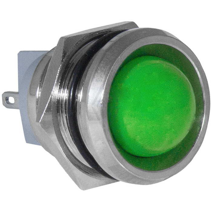 Индикатор антивандальный RUICHI GQ19PR-G, цвет зеленый, точечный излучатель, 12-24 В, 15 мА, гибкие выводы, никелированная латунь - это источник света для демонстрации электрических процессов в приборах. Конструктивно представляет собой модуль индикации, оснащенный контактным блоком, к которому припаиваются или присоединяются проводники.