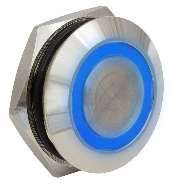 Кнопка антивандальная с подсветкой RUICHI GQ19TF-10E/B/N, OFF-(ON), рабочая температура -25…+55 °C, никелированная латунь, короткая, синяя подсветка максимально долговечна и надежна. Устройство способно безотказно работать при частой эксплуатации и самых тяжелых условиях. Именно поэтому такие кнопки устанавливаются в тех местах, где существует повышенный риск повреждения, например, на производственных предприятиях или объектах с большой проходимостью людей. Антивандальные кнопки часто можно встретить в лифтах, около входных дверей зданий или метрополитене.