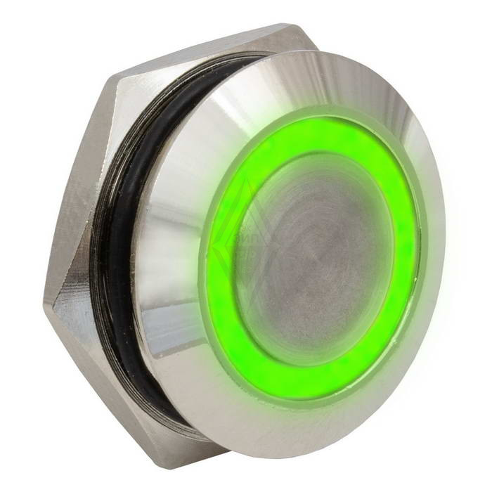 Кнопка антивандальная с подсветкой RUICHI GQ16TF-10E/G/N, OFF-(ON), рабочая температура -25…+55 °C, никелированная латунь, короткая, зелёная подсветка максимально долговечна и надежна. Устройство способно безотказно работать при частой эксплуатации и самых тяжелых условиях. Именно поэтому такие кнопки устанавливаются в тех местах, где существует повышенный риск повреждения, например, на производственных предприятиях или объектах с большой проходимостью людей. Антивандальные кнопки часто можно встретить в лифтах, около входных дверей зданий или метрополитене.