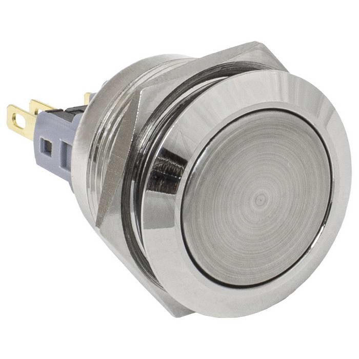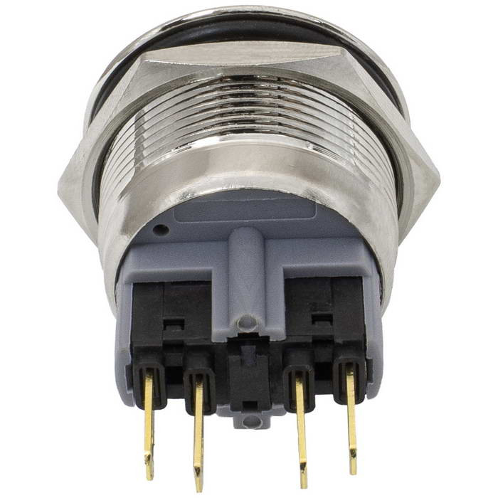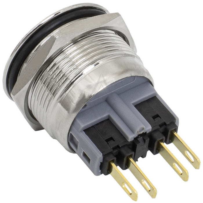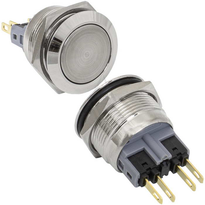 Кнопка антивандальная без подсветки RUICHI GQ22-11 on-(off)+off-(on), М22, IP65, никелированная латунь максимально долговечна и надежна. Устройство способно безотказно работать при частой эксплуатации и самых тяжелых условиях. Именно поэтому такие кнопки устанавливаются в тех местах, где существует повышенный риск повреждения, например, на производственных предприятиях или объектах с большой проходимостью людей. Антивандальные кнопки часто можно встретить в лифтах, около входных дверей зданий или метрополитене.