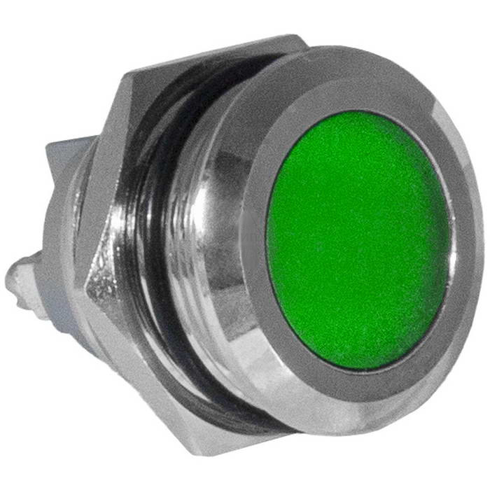 Индикатор антивандальный RUICHI GQ22SF-G, цвет зеленый, точечный излучатель, 12-24 В, 15 мА, гибкие выводы, никелированная латунь - это источник света для демонстрации электрических процессов в приборах. Конструктивно представляет собой модуль индикации, оснащенный контактным блоком, к которому припаиваются или присоединяются проводники.