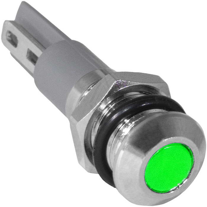 Индикатор антивандальный RUICHI GQ6PF-G, цвет зеленый, точечный излучатель, 12-24 В, 15 мА, гибкие выводы, никелированная латунь - это источник света для демонстрации электрических процессов в приборах. Конструктивно представляет собой модуль индикации, оснащенный контактным блоком, к которому припаиваются или присоединяются проводники.