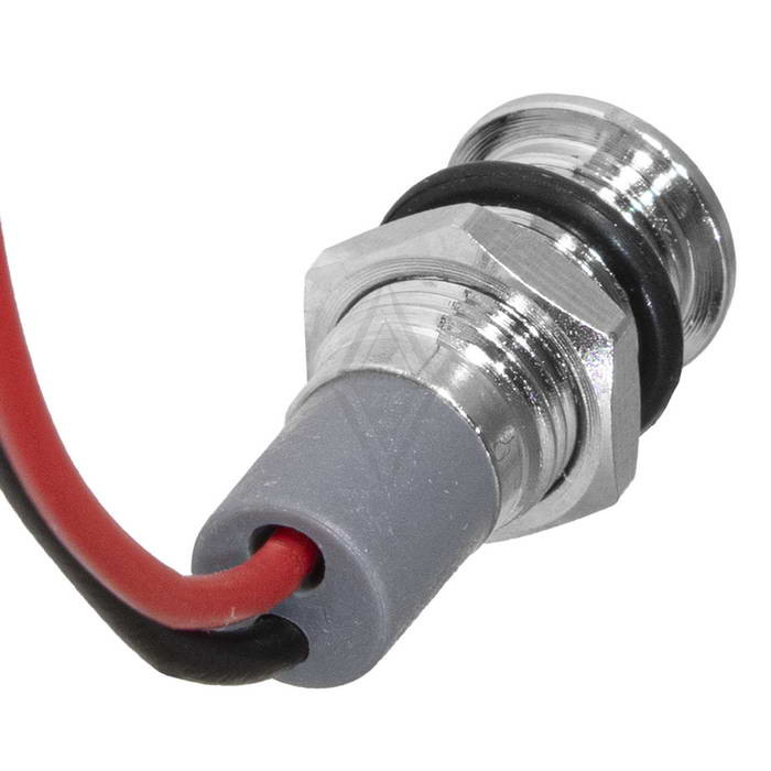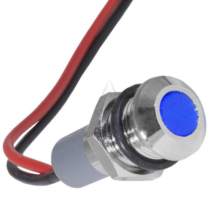 Индикатор антивандальный RUICHI GQ6WF-B, цвет синий, точечный излучатель, 12-24 В, 15 мА, гибкие выводы, никелированная латунь - это источник света для демонстрации электрических процессов в приборах. Конструктивно представляет собой модуль индикации, оснащенный контактным блоком, к которому припаиваются или присоединяются проводники.