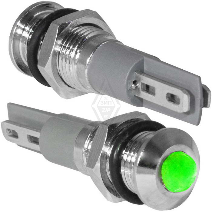 Индикатор антивандальный RUICHI GQ8PR-G, цвет зеленый, точечный излучатель, 12-24 В, 15 мА, гибкие выводы, никелированная латунь - это источник света для демонстрации электрических процессов в приборах. Конструктивно представляет собой модуль индикации, оснащенный контактным блоком, к которому припаиваются или присоединяются проводники.