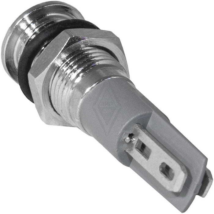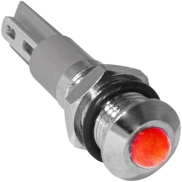 Индикатор антивандальный RUICHI GQ8PR-R, цвет красный, точечный излучатель, 12-24 В, 15 мА, гибкие выводы, никелированная латунь - это источник света для демонстрации электрических процессов в приборах. Конструктивно представляет собой модуль индикации, оснащенный контактным блоком, к которому припаиваются или присоединяются проводники.