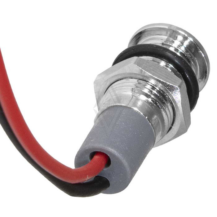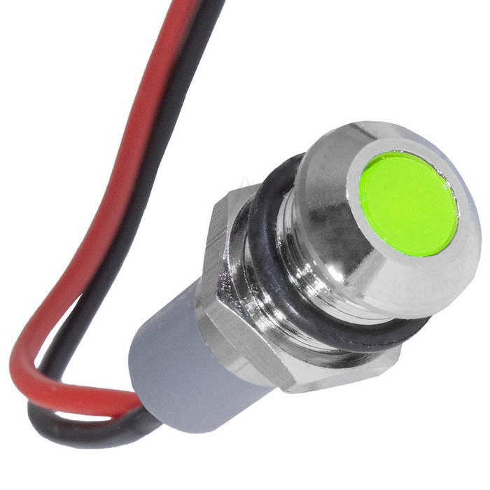 Индикатор антивандальный RUICHI GQ8WF-G, цвет зеленый, точечный излучатель, 12-24 В, 15 мА, гибкие выводы, никелированная латунь - это источник света для демонстрации электрических процессов в приборах. Конструктивно представляет собой модуль индикации, оснащенный контактным блоком, к которому припаиваются или присоединяются проводники.