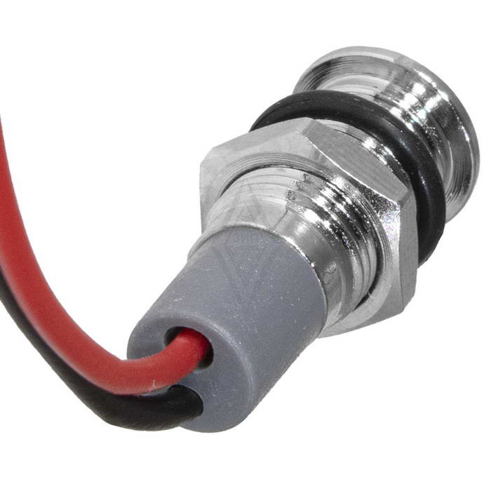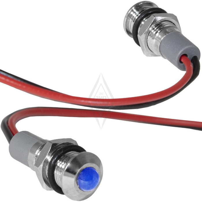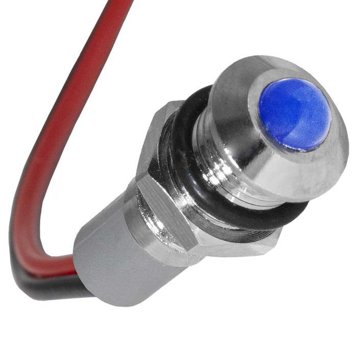 Индикатор антивандальный RUICHI GQ8WR-B, цвет синий, точечный излучатель, 12-24 В, 15 мА, гибкие выводы, никелированная латунь - это источник света для демонстрации электрических процессов в приборах. Конструктивно представляет собой модуль индикации, оснащенный контактным блоком, к которому припаиваются или присоединяются проводники.