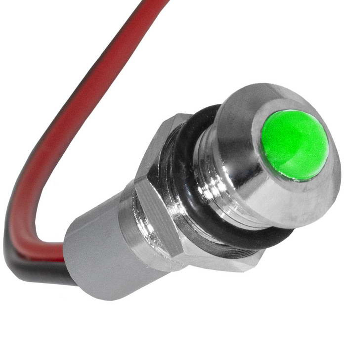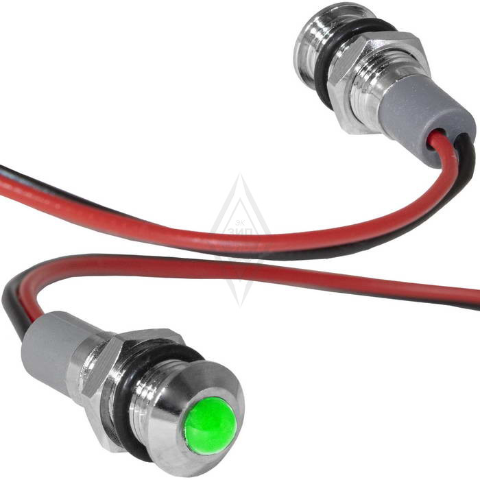 Индикатор антивандальный RUICHI GQ8WR-G, цвет зеленый, точечный излучатель, 12-24 В, 15 мА, гибкие выводы, никелированная латунь - это источник света для демонстрации электрических процессов в приборах. Конструктивно представляет собой модуль индикации, оснащенный контактным блоком, к которому припаиваются или присоединяются проводники.