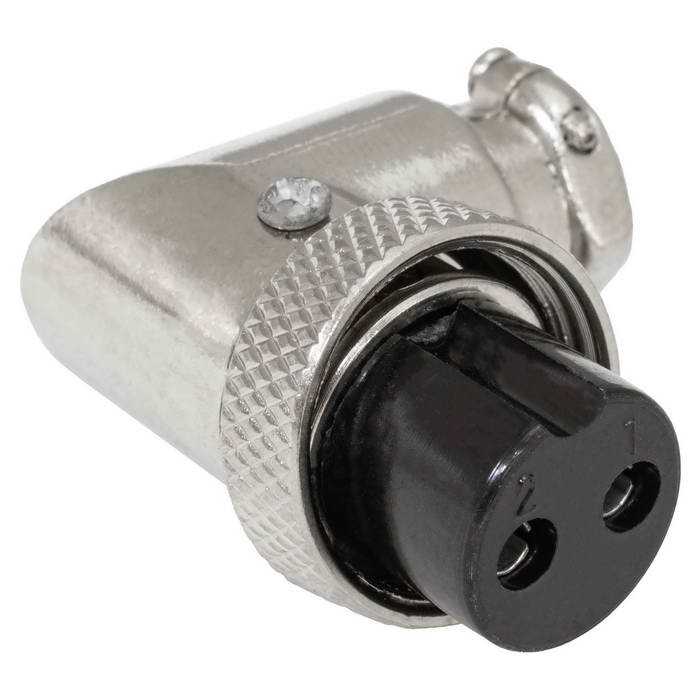 Разъём цилиндрический малогабаритный SZC GX16M-2AA, 2 контакта, угловой представляет собой коннектор ручного соединения, внутреннего объемного монтажа. Он соединяет цепи с нагрузкой до 10 А и 200 В. Корпус соединителей изготовляется из цинка и никеля, а внутренний изолятор из бакелита. Разъемы являются пылезащищенными и соответствуют степени защиты IP 55, что гарантирует работу в пыльной среде и допускает попадания брызг воды.