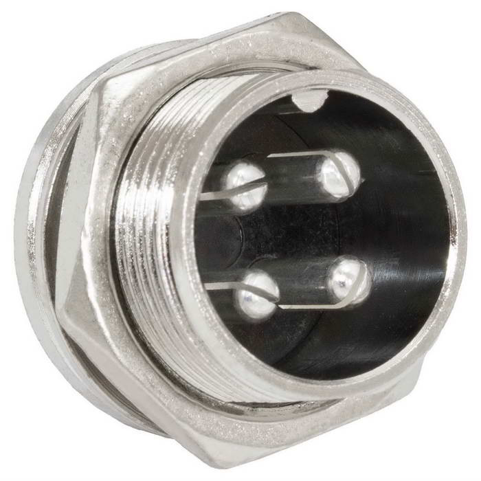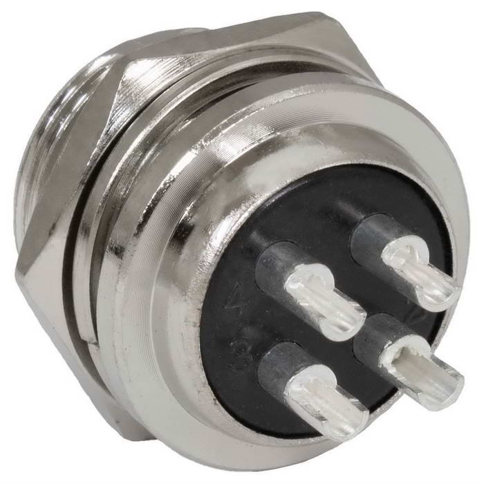 Разъём цилиндрический малогабаритный SZC GX16M-4C, 4 контакта представляет собой коннектор ручного соединения, внутреннего объемного монтажа. Он соединяет цепи с нагрузкой до 10 А и 200 В. Корпус соединителей изготовляется из цинка и никеля, а внутренний изолятор из бакелита. Разъемы являются пылезащищенными и соответствуют степени защиты IP 55, что гарантирует работу в пыльной среде и допускает попадания брызг воды.