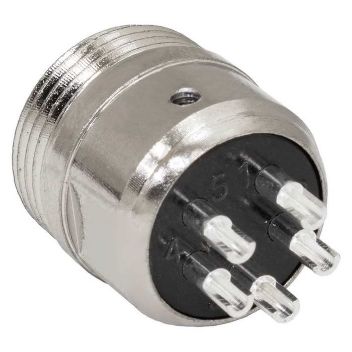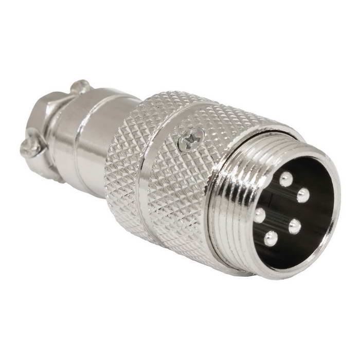 Разъём цилиндрический малогабаритный SZC GX16M-5, 5 контактов представляет собой коннектор ручного соединения, внутреннего объемного монтажа. Он соединяет цепи с нагрузкой до 10 А и 200 В. Корпус соединителей изготовляется из цинка и никеля, а внутренний изолятор из бакелита. Разъемы являются пылезащищенными и соответствуют степени защиты IP 55, что гарантирует работу в пыльной среде и допускает попадания брызг воды.